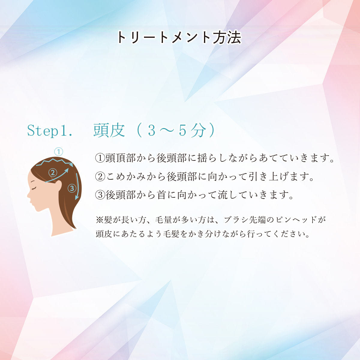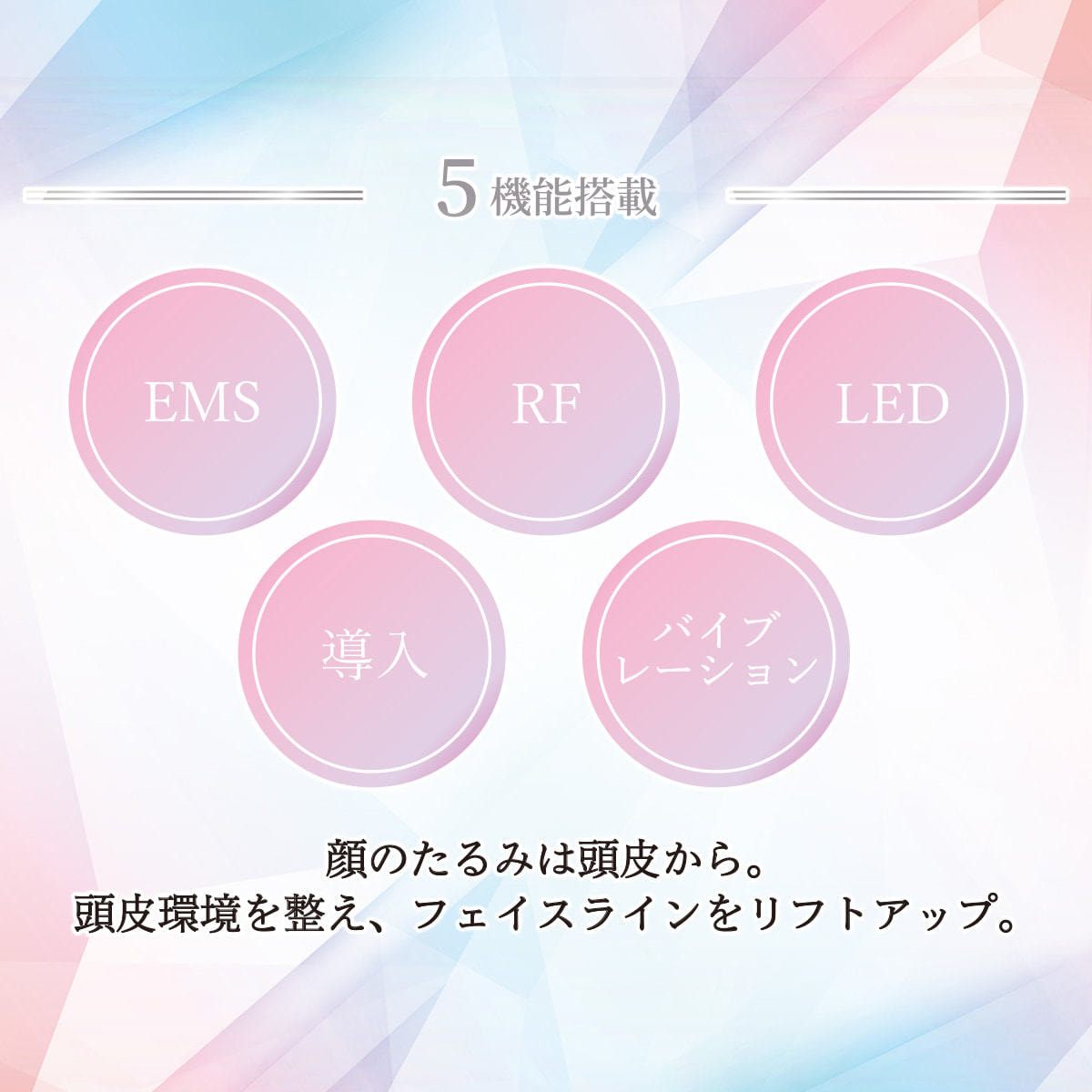 EMS、RF、LED、バイブレーション、導入の5つの機能を搭載したブラシ型ホームケア美容機器です。